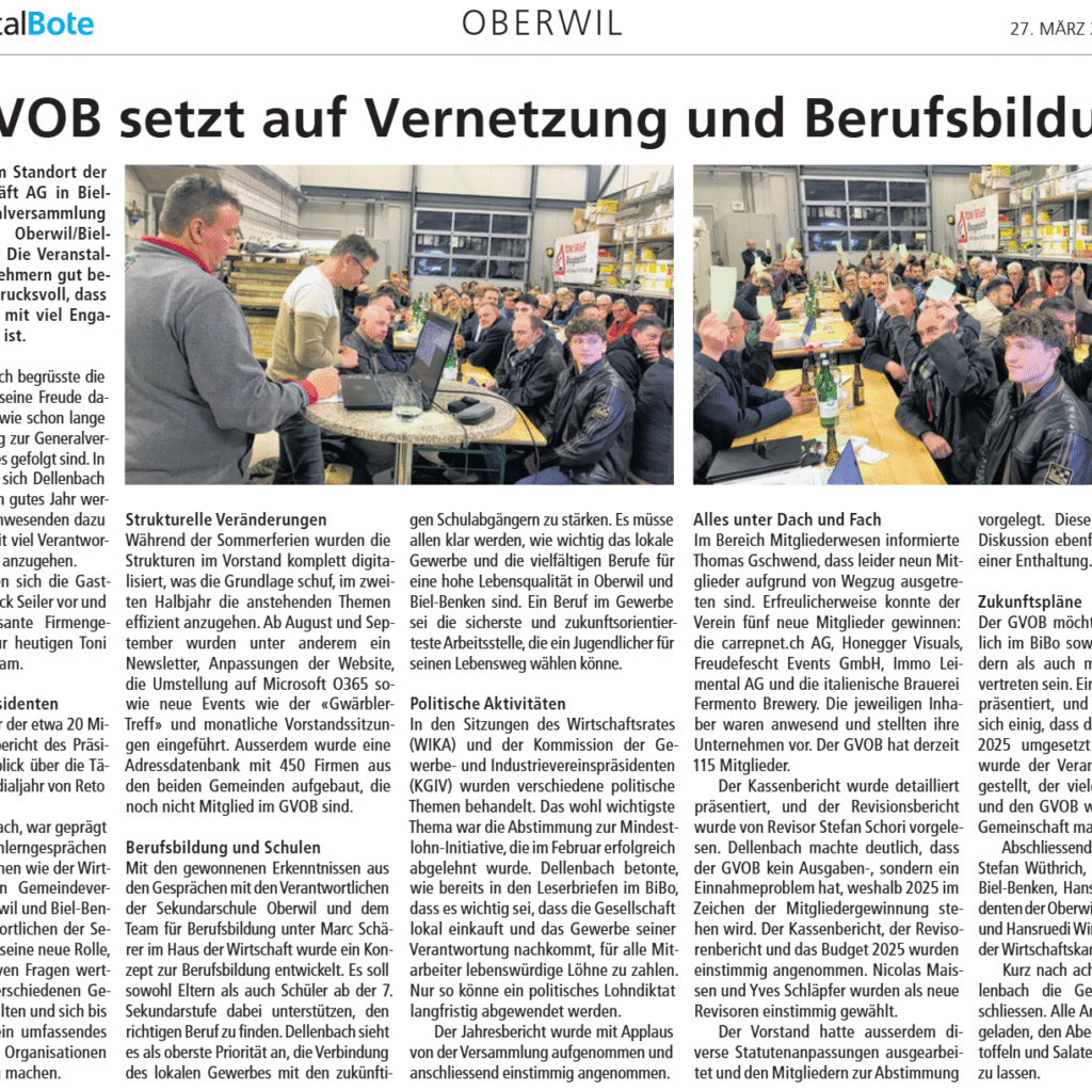 © 2025 GVOB – Gewerbeverein Oberwil / Biel-Benken | Vereinigung der kleinen und mittleren Unternehmen | Datenschutz | Impressum